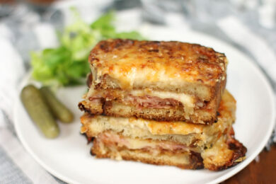 A Croque Monsieur, pronounced “krohk muh-s-yurr,” is yet another culinary gift to us from the French meaning “Crunchy Mister.” Let me tell you that after you try one you’ll never think a ham sandwich is boring ever again. In fact, it might just blow your mind.